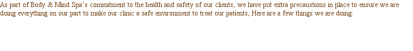 | to the health and safety of our clients, we have put extra precautions in place to ensure we are doing everything on our part to make our clinic a safe environment to treat our patients, Here are a few things we are doing: COVID-19: BODY & MIND SPA SAFETY & HEALTH PROCEDURES |